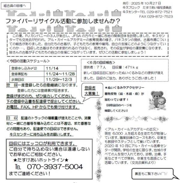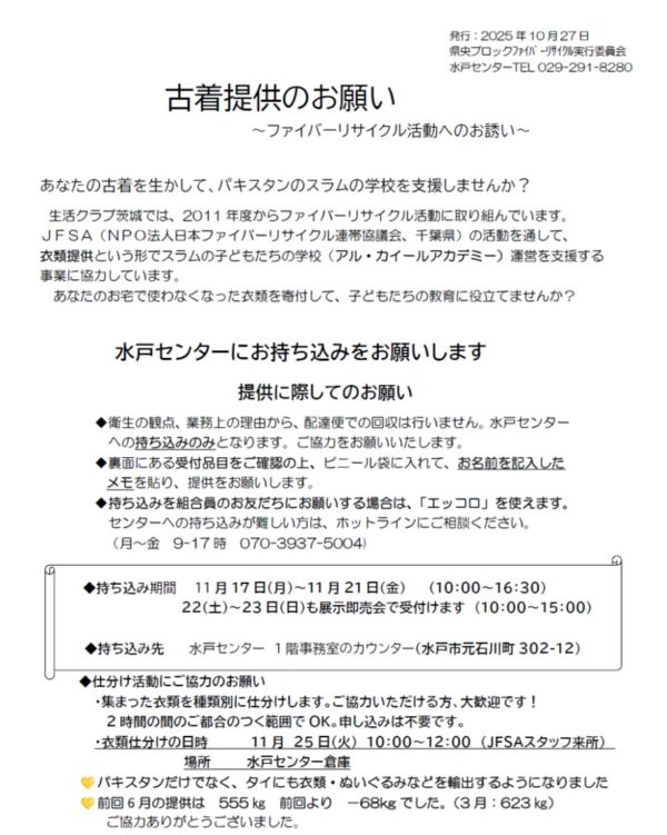生活クラブ茨城では、パキスタンのスラムに暮らす子どもの自立を支える「特定非営利活動法人:JFSA」の活動に賛同し、古着の回収を担っています。