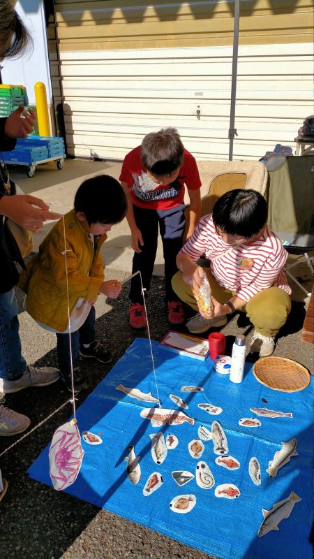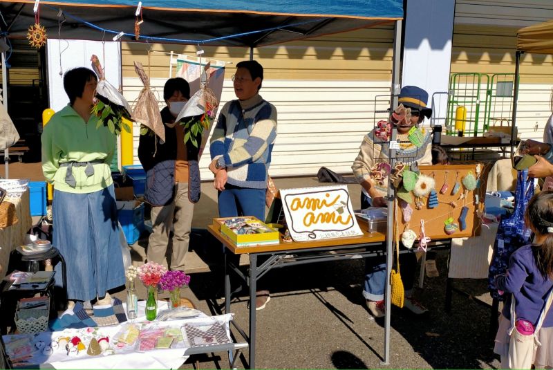 ハンドメイド雑貨の販売、編み小物の販売、ハンドマッサージコーナー、おかし釣り、米粉のパンやおやつの販売がありました。