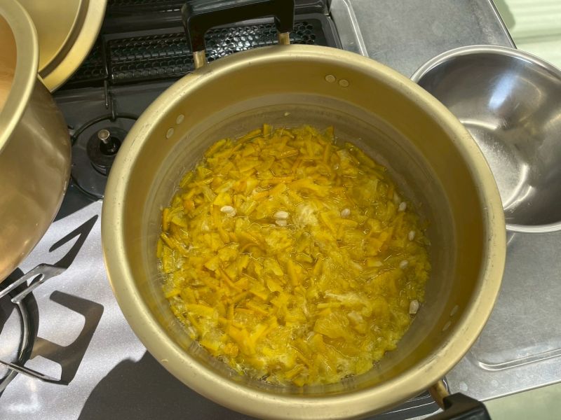 甘夏のゆでこぼしは数回必要ですが、1回目と3回目でどのぐらい苦みが抜けたか味見をしました。