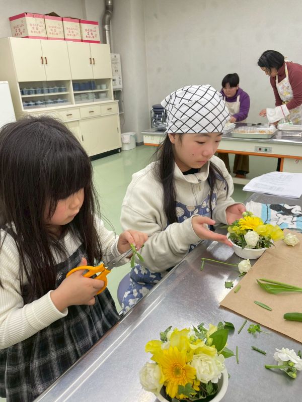 恒例のフラワーアレンジメントをやりたい子は、自分の座るテーブルのアレンジメントを作っていました